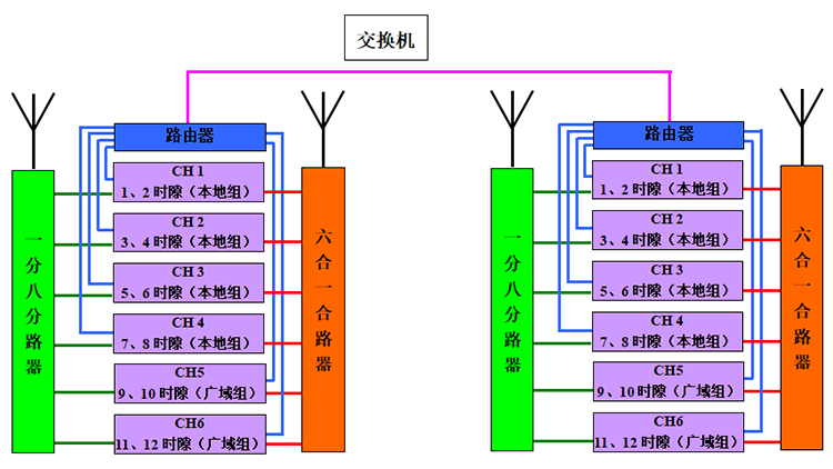 考慮到該集群系統(tǒng)不需要控制信道,那么所有信道都可以作為語音信道使用,較大限度地提供終端使用容量。兩個基站、每基站3中轉(zhuǎn)提供6信道。其中2個中轉(zhuǎn)作為本地組的4個信道,1個中轉(zhuǎn)作為廣域組的2個信道。