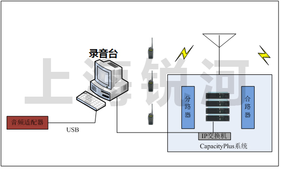 該方式屬于錄音,即通過網(wǎng)絡(luò)直接獲取數(shù)字中繼臺(tái)的語(yǔ)音數(shù)據(jù)包,解析后存儲(chǔ)到錄音臺(tái)上,相對(duì)于基礎(chǔ)方案這種方式的主要優(yōu)勢(shì)是有利于以后錄音系統(tǒng)的擴(kuò)展以及保證整個(gè)系統(tǒng)不會(huì)被過多的車載臺(tái)的信號(hào)干擾。整個(gè)錄音系統(tǒng)安裝調(diào)試方便,只需將錄音臺(tái)接入Capacity Plus數(shù)字集群系統(tǒng)即可,并且后續(xù)的維護(hù)也便利。