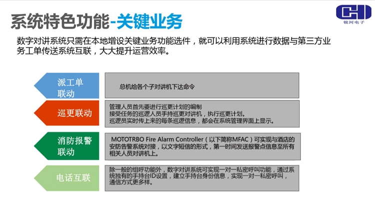 上海銳河電子科技有限公司關(guān)于數(shù)字無線對講系統(tǒng)特色功能以及關(guān)鍵業(yè)務(wù)介紹: