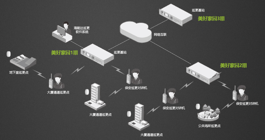 方案特點:部署方便,減少通信盲區(qū)。通過配備巡更基站,解決信號覆蓋問題,并統(tǒng)控制巡更對講機上傳的巡更數(shù)據(jù)。