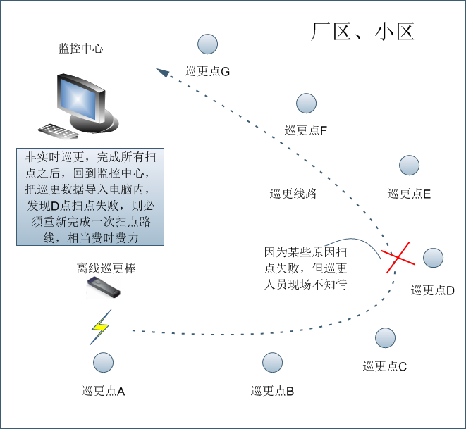 缺點(diǎn):由于某個(gè)情況影響,某個(gè)巡檢點(diǎn)掃點(diǎn)失敗,而巡檢人員當(dāng)場(chǎng)并不知情,完成全部巡檢路線之后回到監(jiān)控中心導(dǎo)出巡檢信息確認(rèn)時(shí)發(fā)現(xiàn)某點(diǎn)掃點(diǎn)失敗,則其必須再次出去重新完成這次巡檢任務(wù),相當(dāng)費(fèi)時(shí)費(fèi)力,而且限于事后監(jiān)控、實(shí)效性差。
