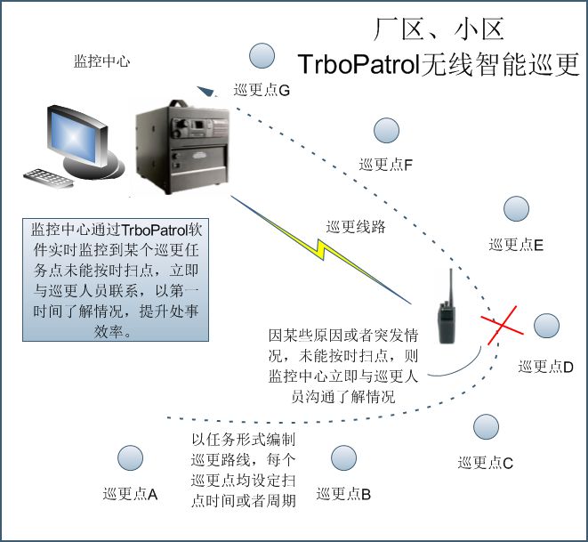 TrboPatrol--“智能對(duì)講巡檢系統(tǒng)”在摩托羅拉MOTOTRBO?系列對(duì)講機(jī)中融合了較新的無線巡檢技術(shù),巡檢員出門巡檢只需攜帶部摩托羅拉對(duì)講機(jī),即可方便的記錄下工作人員到達(dá)巡查點(diǎn)的時(shí)間及狀態(tài)信息,并通過計(jì)算機(jī)巡查情況分析,制定巡查計(jì)劃、排班管理等,同時(shí)又能通過對(duì)講機(jī)上報(bào)、處理在巡檢過程中發(fā)現(xiàn)問題,保證時(shí)效性,減少安全事故,從而達(dá)到事半功倍的效果。