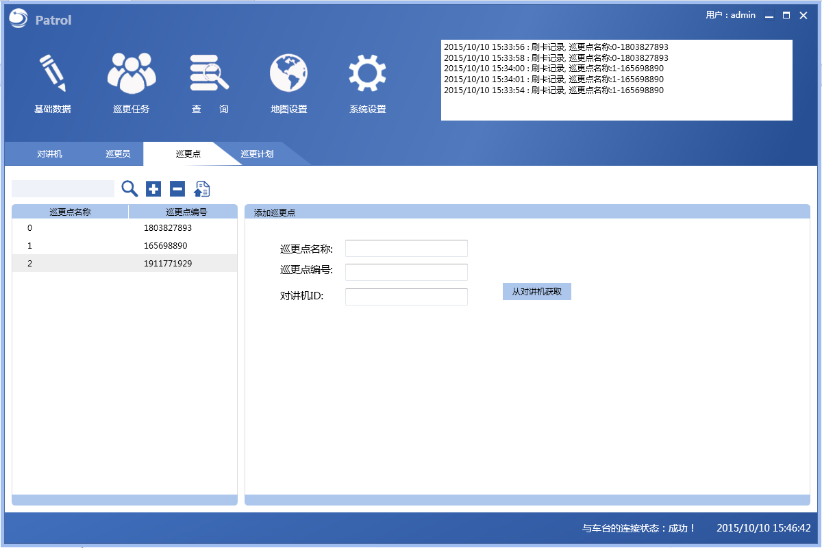 軟件左側(cè)會(huì)出現(xiàn)所有已添加的巡檢點(diǎn),在軟件右側(cè)根據(jù)需要自行設(shè)定巡檢路線以及時(shí)間等信息,接受任務(wù)的巡邏人員手持巡檢對(duì)講機(jī),根據(jù)預(yù)先編制的巡檢計(jì)劃來執(zhí)行。對(duì)講機(jī)仍然可以常規(guī)的通話對(duì)講使用。將巡檢對(duì)講機(jī)靠近巡視點(diǎn)(通常安裝在墻壁上),系統(tǒng)就可獲得當(dāng)前巡邏人員的位置。