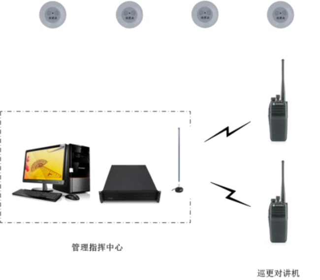 TrboPatrol系統(tǒng)由管理指揮中心、巡更對(duì)講機(jī)以及巡更點(diǎn)(鈕)等設(shè)備組成。系統(tǒng)示意圖如下圖所示。