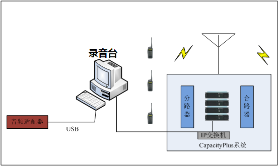 在無線對講系統(tǒng)中,智能調(diào)度系統(tǒng),該方式屬于錄音,即通過網(wǎng)絡(luò)直接獲取數(shù)字中繼臺的語音數(shù)據(jù)包,解析后存儲到錄音臺上,相對于基礎(chǔ)方案這種方式的主要優(yōu)勢是有利于以后錄音系統(tǒng)的擴(kuò)展以及保證整個(gè)系統(tǒng)不會(huì)被過多的車載臺的信號干擾。整個(gè)錄音系統(tǒng)安裝調(diào)試方便,只需將錄音臺接入Capacity Plus數(shù)字集群系統(tǒng)即可,并且后續(xù)的維護(hù)也便利。