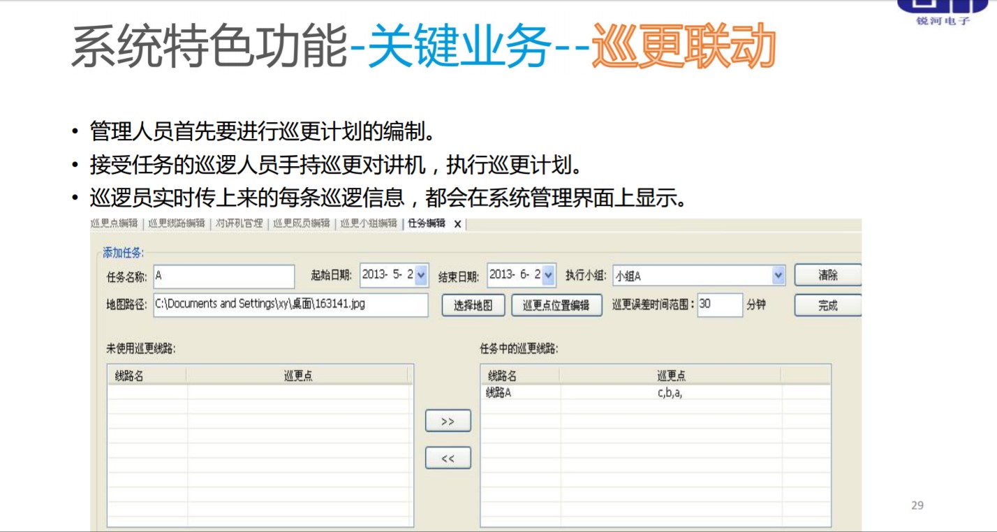 巡更聯(lián)動 :管理人員首先要進行巡更計劃的編制接受任務(wù)的巡邏人員手持巡更對講機,執(zhí)行巡更計劃。