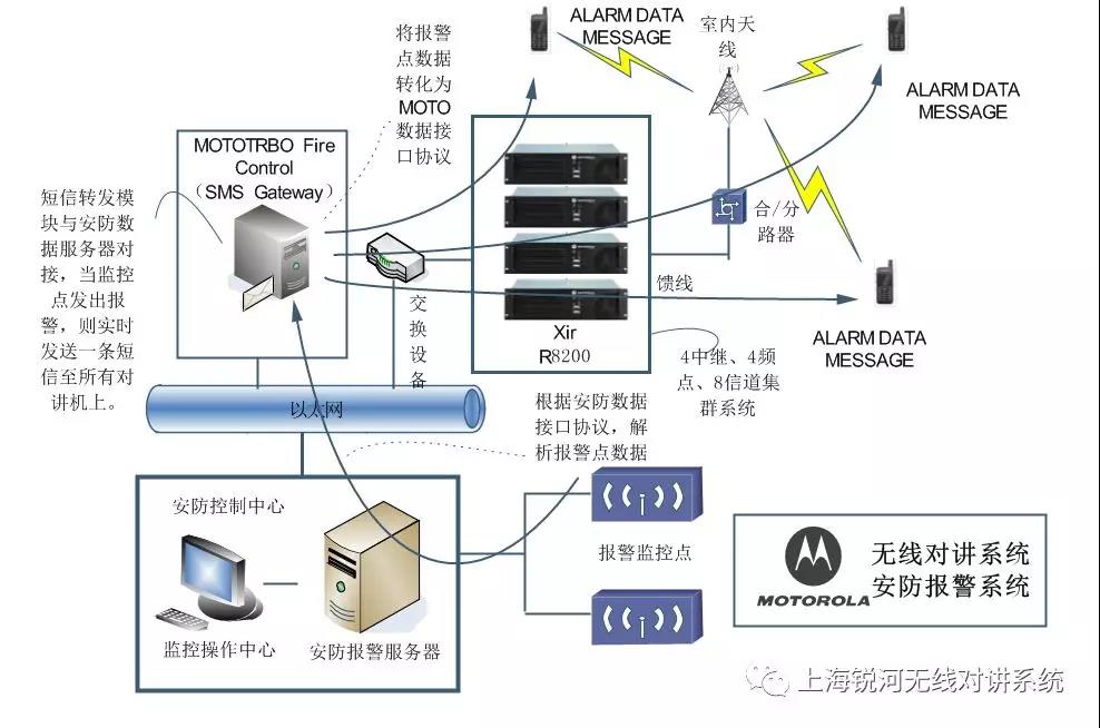 通過項目內(nèi)部網(wǎng)絡連接至中繼臺,前端對接至安防控制中心系統(tǒng),后端通過對講機的無線分布覆蓋,實現(xiàn)報警信息發(fā)送至對講機。